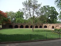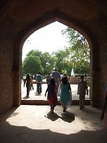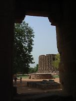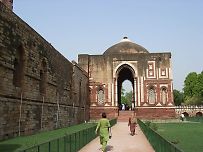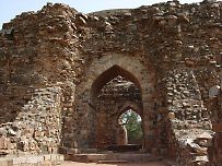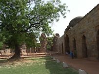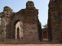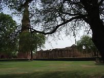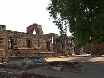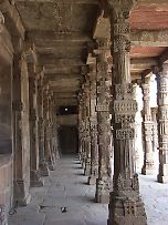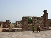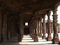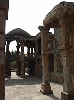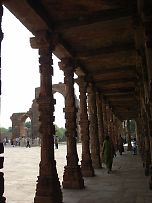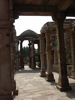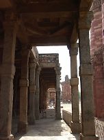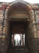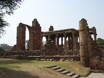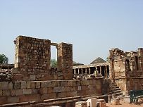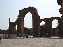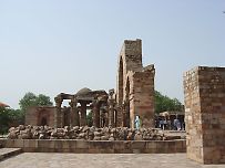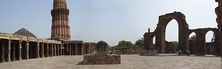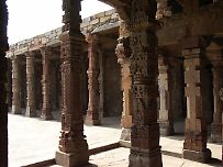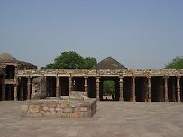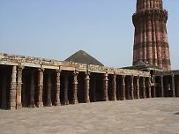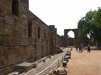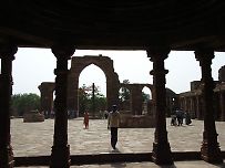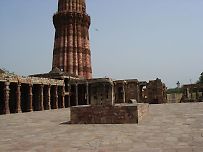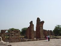 | Central plaza with Qutubminar, gate and cylindrical shafts. |