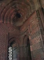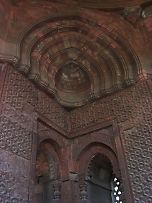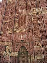 | The minaret is made of fluted red sandstone covered with intricate carvings and verses from the Qur'an. |